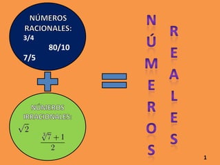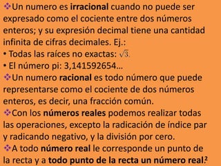 El documento presenta información sobre números reales, racionales e irracionales, expresiones algebraicas, ecuaciones, funciones y proporcionalidad. Explica que los números reales incluyen a los racionales e irracionales, y que una expresión algebraica combina números y letras con operaciones. También define conceptos como ecuación, función, proporción y sistema de ecuaciones.
