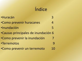 Este documento describe varios desastres naturales como huracanes, inundaciones y terremotos, y proporciona información sobre cómo prevenir y prepararse para ellos. Explica los principales tipos de desastres, sus causas y efectos, así como medidas de prevención y acciones recomendadas antes, durante y después de que ocurran, como preparar suministros de emergencia, conocer rutas de evacuación, cortar servicios en caso necesario y buscar refugio de forma segura.