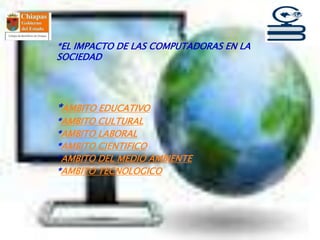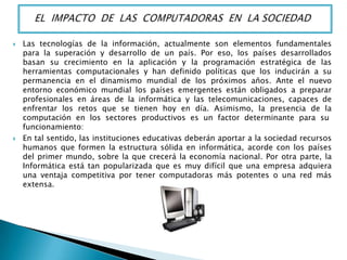 El documento describe el amplio impacto de las computadoras en la sociedad en varios ámbitos como la educación, la cultura, el trabajo, la ciencia, el medio ambiente y la tecnología. Específicamente, las computadoras han revolucionado la educación, facilitado el acceso a la cultura, transformado el trabajo a través de la automatización, impulsado el progreso científico, fomentado prácticas más sostenibles con el medio ambiente y acelerado el desarrollo tecnológico.