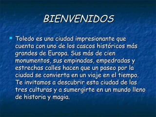 Toledo es una ciudad histórica española rica en monumentos que data de las épocas romana, visigoda y musulmana. Algunos de sus principales puntos de interés son la catedral gótica, el Alcázar, la Puerta del Sol y la Puerta de Bisagra, así como numerosas mezquitas, iglesias, puentes y museos que documentan su larga y diversa historia.