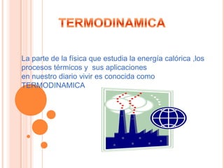 La termodinámica estudia la energía calórica, los procesos térmicos y sus aplicaciones. Sus leyes incluyen la conservación de la energía, que el calor no fluye espontáneamente de los cuerpos más fríos a los más calientes, y que la entropía aumenta en todo proceso natural. Existen procesos termodinámicos como los adiabáticos, isotérmicos, isométricos e isobáricos relacionados con mantener constante una de las tres variables de estado.