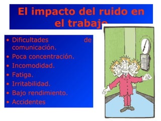 El documento describe los efectos negativos del ruido para la salud, incluyendo dificultades de comunicación, falta de concentración e irritabilidad en el trabajo, así como constricción de vasos sanguíneos, alta presión sanguínea y problemas de sueño para el organismo. Además, señala que el ruido puede tener impactos como alteraciones del ciclo menstrual, impotencia y zumbidos en los oídos, afectando la salud y sociedad.