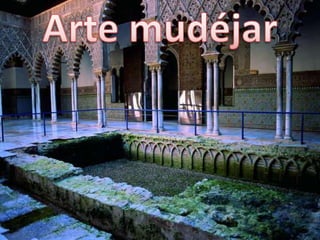 El arte mudéjar se desarrolló en la Península Ibérica entre los siglos XII y XVI, utilizando materiales como el ladrillo, yeso y madera. Presenta características regionales como el mudéjar toledano, leonés, aragonés y andaluz. Algunos ejemplos notables son la Iglesia de San Pedro en Teruel, el Alcázar y el Pabellón mudéjar en Sevilla, y el claustro del Monasterio de Guadalupe.