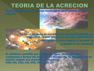 El documento describe la formación de los planetas a partir de la acumulación de polvo cósmico. Al estratificarse la Tierra, fue bombardeada por meteoritos que generaron calor interno que fundió el polvo en volcanes. Al enfriarse, el vapor de agua se condensó formando océanos y gases en la atmósfera. Similarmente, la materia en el universo estaba comprimida por el calor y la presión hasta que explotó dando lugar a nuestra galaxia y los planetas.