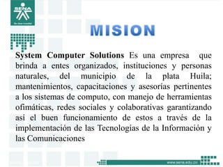 System Computer Solutions es una empresa en La Plata, Huila, Colombia que brinda mantenimiento de equipos de computo, asesorías y capacitaciones en herramientas ofimáticas e implementación de tecnologías de la información y comunicación a organizaciones e individuos para garantizar el buen funcionamiento de sus sistemas de computo. La empresa busca ser la opción más confiable y oportuna en 2018 para estos servicios, contribuyendo al desarrollo intelectual y socioeconómico de la región.