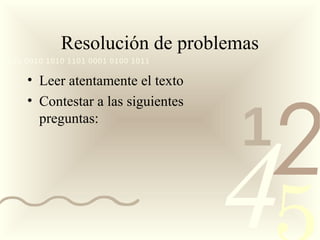 El documento habla sobre la resolución de problemas matemáticos. Explica que para resolver un problema hay que leerlo atentamente, identificar los datos dados y necesarios, determinar la pregunta, y realizar los cálculos necesarios para encontrar la solución y explicarla brevemente.