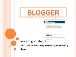 Blogger ofrece un servicio gratuito para crear un blog personal donde los usuarios pueden publicar contenido sobre cualquier tema, incluyendo sus pensamientos, opiniones e ideas. Los blogs pueden personalizarse y comparten con amigos. Sin embargo, el contenido debe respetar las políticas como prohibir la pornografía, la violencia, la suplantación de identidad y actividades ilegales.
