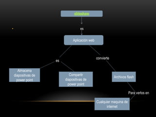 SlideShare es una aplicación web que permite almacenar presentaciones de diapositivas de PowerPoint para compartirlas y verlas desde cualquier dispositivo con acceso a Internet. Los usuarios pueden crear una cuenta en SlideShare para subir archivos en formatos como PDF, Word y PowerPoint, y luego publicarlos para que otros usuarios puedan ver las presentaciones sin necesidad de descargar archivos.