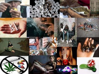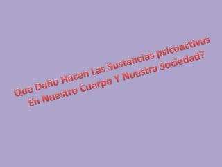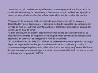 El documento discute el uso y efectos de las sustancias psicoactivas. Explica que su consumo puede alterar los estados de conciencia y pensamiento, e incluye drogas como el tabaco, el alcohol, la marihuana, anfetaminas, éxtasis, cocaína y heroína. También analiza las tendencias de consumo a nivel mundial de diferentes drogas y los daños que pueden causar a la salud.