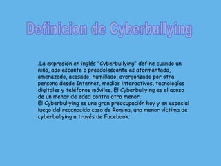 El documento define el término "cyberbullying" como el acoso o intimidación de un niño o adolescente a través de Internet o tecnología digital. Explica que el cyberbullying es el acoso de un menor hacia otro y que es una gran preocupación, citando el caso de Romina como ejemplo de una víctima de cyberbullying a través de Facebook.