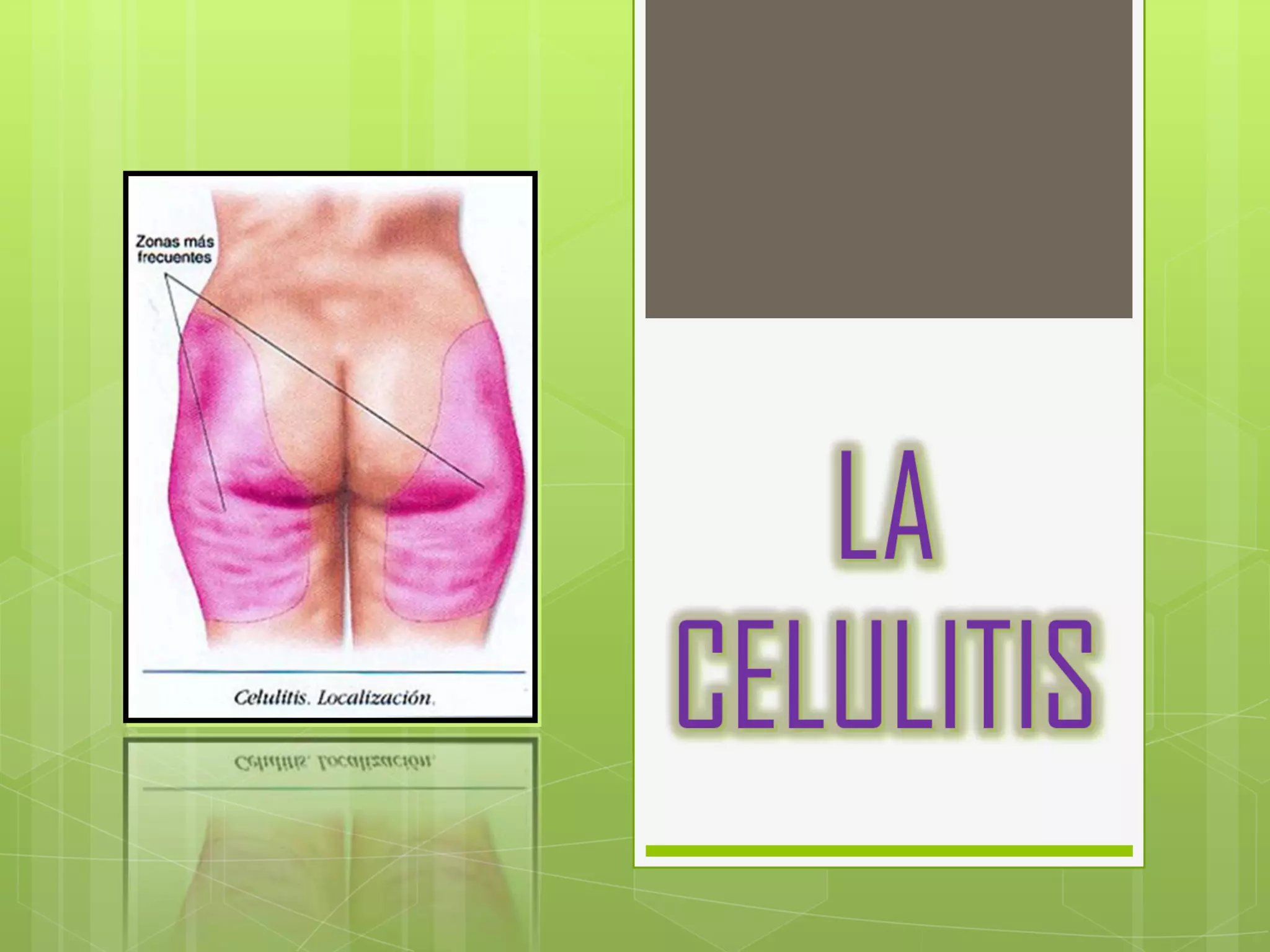 La celulitis se clasifica en grados de levedad y su fisiopatología involucra cuatro fases evolutivas que van desde la dilatación vascular hasta la formación de fibrosis. El tratamiento incluye medidas dietéticas, carboxiterapia, mesoterapia, presoterapia y vacumterapia para mejorar la circulación y drenar el edema.