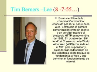 El documento presenta breves biografías de importantes figuras en el desarrollo de la computación e Internet como Tim Berners-Lee, inventor de la World Wide Web; Larry Page y Sergey Brin, creadores de Google; y Alan Turing, considerado uno de los padres de la ciencia de la computación. También incluye biografías de pioneros en el desarrollo de hardware como Gordon Moore, cofundador de Intel; Don Estridge, conocido como el padre del IBM PC; y Jean Hoerni, pionero en los transistores de silicio. El documento finaliza recon
