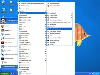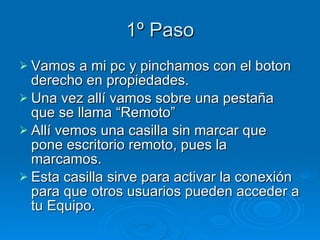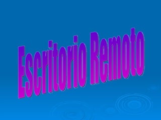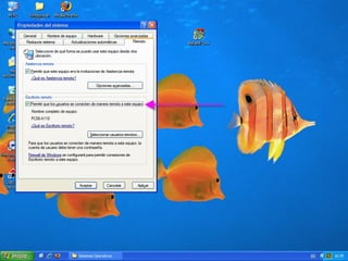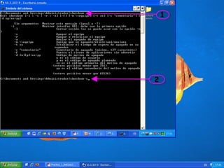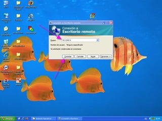 El documento proporciona instrucciones en 6 pasos para configurar y utilizar el escritorio remoto en Windows para acceder y controlar otro equipo de la misma red: 1) Activar la opción de escritorio remoto en Propiedades, 2) Agregar usuarios permitidos, 3) Abrir la conexión de escritorio remoto e ingresar la dirección IP del equipo remoto, 4) Ingresar la contraseña del equipo remoto para acceder, 5) Navegar y controlar el equipo remoto una vez conectado, 6) Usar el comando "Shutdown