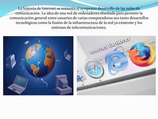 El documento describe la historia del desarrollo de Internet desde las primeras ideas en la década de 1960 hasta su expansión global en la década de 1990. Las primeras discusiones sobre redes de computadoras interconectadas ocurrieron en los memorandos de J.C.R. Licklider en 1962, mientras que implementaciones prácticas comenzaron a fines de la década de 1980 con tecnologías como TCP/IP. En la década de 1990, la World Wide Web se hizo común y la infraestructura de Internet se extendió por todo el mundo.