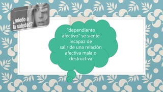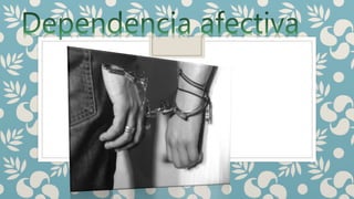 El documento habla sobre la dependencia afectiva y sus características. Las personas con dependencia afectiva se sienten incapaces de salir de relaciones dañinas y pierden su autoestima. Sufren ansiedad y depresión cuando la pareja no les presta atención. La dependencia afectiva a menudo se origina en una dependencia excesiva de los padres desde la niñez. Para superar la dependencia, las personas deben reconocer el problema, fortalecer su autoconfianza y aceptar que sus parejas no son perfectas.