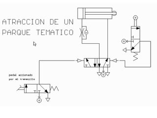 El documento presenta cuatro ejercicios de proyectos de circuitos hidroneumáticos para ser desarrollados en AutoCAD por estudiantes de un liceo técnico. Los ejercicios incluyen el diseño de un circuito para una estampadora neumática, el control de puertas de un autobús, la atracción de un parque temático con la salida rápida de un muñeco al pasar un tren, y un percutor neumático para apisonar tierra. El profesor Carlos López instruye a los estudiantes a