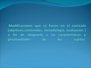El documento describe dos tipos de adaptaciones curriculares para estudiantes con necesidades especiales: adaptaciones poco significativas como cambios en la entrega de material pero no en el contenido, y adaptaciones significativas que implican cambios sustanciales en los contenidos y criterios de evaluación para acomodar las necesidades del estudiante.