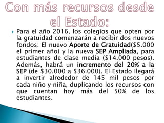 El documento describe los cambios en el financiamiento de la educación en Chile a partir del 2016, incluyendo dos nuevos fondos para colegios gratuitos, un incremento del 20% en el fondo general por alumno, y que el Estado invertirá cerca de 145 mil pesos por cada niño, duplicando los recursos disponibles. También establece que los colegios deberán dejar de seleccionar de forma gradual y que todos los niños podrán postular sin ser discriminados o requerir antecedentes económicos.