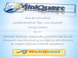 Una Miniquest es un módulo de instrucción en línea similar a una Webquest pero más breve, generalmente diseñado para completarse en una sesión. Consta de tres partes: un escenario que presenta un contexto y una pregunta clave, una tarea con preguntas para recopilar información para responder la pregunta clave, y un producto que describe lo que los estudiantes crearán para responder la pregunta. Las Miniquest tienen ventajas como requerir poco tiempo de elaboración y enfocarse en procesar y analizar información más que solo buscarla.