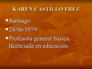 Este currículum presenta a Karen Castillo Frez, nacida en 1979, quien es profesora general básica y licenciada en educación. Actualmente enseña Lenguaje, Matemáticas y Educación Artística en el 2° Básico en el Colegio Alma Mater. Sus objetivos para 2010 son terminar su pos-título y realizar un magister en Educación.