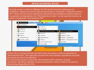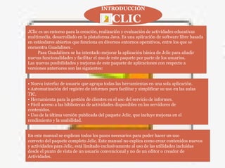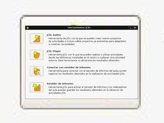 JClic es un entorno para crear, ejecutar y evaluar actividades educativas multimedia desarrollado en Java. El paquete JClic para Guadalinex incluye nuevas funcionalidades como una interfaz unificada, automatización de informes y acceso a bibliotecas de actividades. Las herramientas principales de JClic son JClic Author para crear actividades, JClic Player para ejecutarlas y el Servidor de Informes para almacenar resultados.
