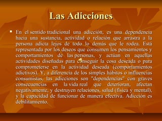 El documento describe las adicciones más comunes en Guatemala, incluyendo la adicción al alcohol, el tabaquismo y las drogas. El alcoholismo y el tabaquismo pueden causar graves daños a la salud como cáncer y enfermedades del corazón. La drogadicción a menudo comienza a una edad más temprana y los drogadictos consumen sustancias más peligrosas. Estas adicciones tienen graves consecuencias personales y sociales. El documento también menciona algunos centros de rehabilitación disponibles en Guatemala.