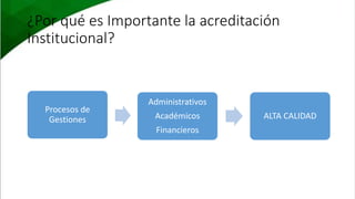 La acreditación institucional es importante porque garantiza que una institución cumpla con altos estándares de calidad en sus procesos administrativos, académicos y financieros. Para lograr la acreditación, una institución debe cumplir con condiciones previas como tener un registro calificado vigente y procesos de autoevaluación. A partir de 2016, los nuevos lineamientos exigen que las instituciones tengan al menos el 25% de sus programas acreditados y acrediten todas sus sedes y seccionales.
