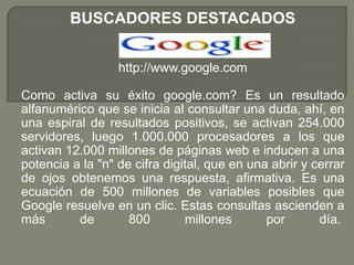 Google es el buscador más popular con más de 800 millones de búsquedas diarias que son procesadas por 254,000 servidores y 1,000,000 procesadores. Yahoo es uno de los sitios más importantes en internet que ofrece un motor de búsqueda mejorado y personalizable. Searchmash de Google ofrece resultados agrupados visualmente con pocos caracteres. Wikia Search es un buscador de código abierto creado por Wikipedia que incluye valores de relevancia para cada enlace.