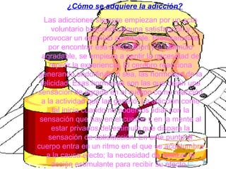 El documento resume los efectos del alcoholismo en el cuerpo y la mente. Explica que la adicción empieza como un acto voluntario que genera sensaciones placenteras en el cerebro, pero luego el cuerpo se acostumbra y necesita la sustancia para sentirse bien. El alcohol afecta químicamente las membranas celulares y puede causar intoxicación e incluso la muerte. Muchos alcohólicos no reconocen su enfermedad. Para curarse deben evitar el alcohol completamente, aunque a veces será difícil. Los datos estadísticos m