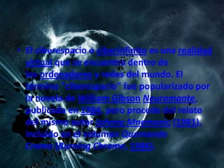 El ciberespacio es una realidad virtual dentro de las redes y ordenadores del mundo, un término popularizado por William Gibson para referirse al entorno no físico creado por equipos de computo conectados. John Perry Barlow escribió la Declaración de independencia del ciberespacio instando a los gobiernos a no ejercer soberanía sobre este nuevo hogar de la mente. El ciberespacio permite a los usuarios interactuar de forma similar al mundo real pero sin moverse físicamente más allá de escribir, pudiendo intercambiar información, comp