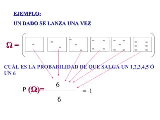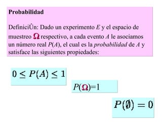 El documento define la probabilidad como una medida numérica asociada a eventos en un experimento aleatorio, que cumple ciertas propiedades. Presenta ejemplos de cálculo de probabilidades para lanzar un dado y analiza conceptos como eventos mutuamente excluyentes, eventos independientes y probabilidad condicional.