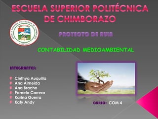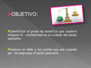 Este documento trata sobre la contabilidad medioambiental. Su objetivo es identificar los beneficios de integrar la contabilidad en el cuidado del medio ambiente y conocer los daños y costos que causan las empresas al medio ambiente. La contabilidad medioambiental mide el impacto monetario y físico que tienen las empresas en la naturaleza, identificando costos como limpieza de contaminación, multas e impuestos. Además, ayuda a las empresas a determinar sus costos ambientales y mejorar la gestión.