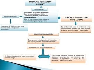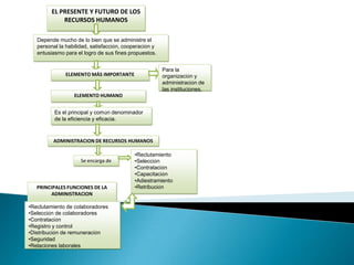 Este documento describe la importancia de la administración de recursos humanos para el éxito de una organización. Explica que los empleados son el elemento más importante y que depende de su habilidad, satisfacción y cooperación el logro de los objetivos de la organización. Detalla las principales funciones de la administración de recursos humanos como el reclutamiento, selección, capacitación y retribución del personal. Además, cubre temas como el liderazgo, la comunicación y las fases del proceso de recursos humanos que incluyen el