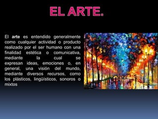 El documento trata sobre el concepto de arte a lo largo de la historia. Explica que el arte ha evolucionado de ser considerado como cualquier habilidad manual durante la antigüedad clásica, a conceptos más subjetivos e individuales en el siglo XX. También discute las diferentes clasificaciones de los géneros artísticos como la pintura, literatura, música y cine. Por último, define la estética como la rama de la filosofía que estudia cómo los humanos interpretan los estímulos sensoriales del mundo y su relación con el arte