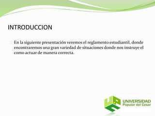 Este documento presenta un resumen del reglamento estudiantil de la Universidad Popular del Cesar. Explica que el reglamento establece normas para regular las actividades de los estudiantes y promover la convivencia. Detalla algunas situaciones en las que se debe aplicar el reglamento, como en casos de fraude académico, agresión física, pérdida de semestre o cuando un estudiante falta mucho a clases. Concluye que el reglamento es una guía importante que estipula los deberes y derechos de los estudiantes.