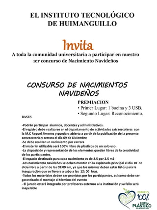 El Instituto Tecnológico de Huimanguillo invita a la comunidad universitaria a participar en su primer concurso de nacimientos navideños, en el que se premiará al primer y segundo lugar. El concurso está abierto a alumnos, docentes y administrativos, quienes deberán registrarse antes del 9 de diciembre e instalar su nacimiento el 10 de diciembre para la inauguración. Cada participante deberá construir un nacimiento por carrera usando materiales libres en un espacio de 2.5x2.5 metros,