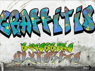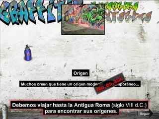 El documento explora los orígenes del graffiti, remontándose a la antigua Roma donde los graffitis en muros y columnas expresaban las preocupaciones de los romanos. Más tarde, en la década de 1960, el graffiti tomó la forma moderna a través de la acción de "Taki 183", un adolescente griego que comenzó a estampar su apodo por toda la ciudad de Nueva York, inspirando a otros jóvenes y popularizando el graffiti como forma de expresión.