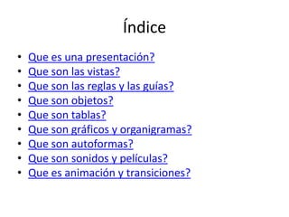 Este documento presenta un índice sobre los conceptos básicos de PowerPoint. Explica brevemente qué son una presentación, las vistas, reglas y guías, objetos, tablas, gráficos, autoformas, sonidos, películas, animación y transiciones en PowerPoint. El documento proporciona una guía introductoria sobre los elementos y herramientas principales de PowerPoint.
