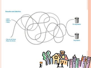 Este documento trata sobre la importancia del reciclaje y el manejo adecuado de los residuos sólidos. Explica que los residuos sólidos incluyen materiales biodegradables, plásticos, papel y otros. Recomienda separar los residuos orgánicos para hacer compostaje y producir abono, y aplicar las tres erres: reducir, reusar y reciclar para prevenir la contaminación. También propone actividades para enseñar a otros sobre el manejo de residuos y posibles soluciones a problemas con los residuos en la com
