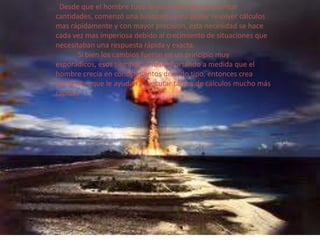 Este documento describe la evolución de la tecnología para realizar cálculos matemáticos de forma más rápida y precisa. En particular, destaca la máquina sumadora creada por Blaise Pascal en el siglo XVII que utilizaba engranajes para sumar y restar números de forma mecánica. Luego explica detalladamente el proceso de suma utilizado por la máquina de Pascal como predecesora de la idea de almacenar resultados en memoria propuesta posteriormente por Von Neumann para agilizar cálculos.