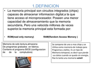 Este documento describe los diferentes tipos de memoria RAM y ROM. Explica que la RAM es una memoria volátil que almacena información de forma temporal para que los programas y datos puedan ser accedidos rápidamente, mientras que la ROM almacena programas de forma permanente. Luego detalla los diferentes módulos y generaciones de memoria RAM como SDRAM, DDR SDRAM, DDR2 SDRAM y DDR3 SDRAM, indicando sus velocidades máximas. Finalmente, muestra dónde se ubica físicamente la memoria RAM en la placa base