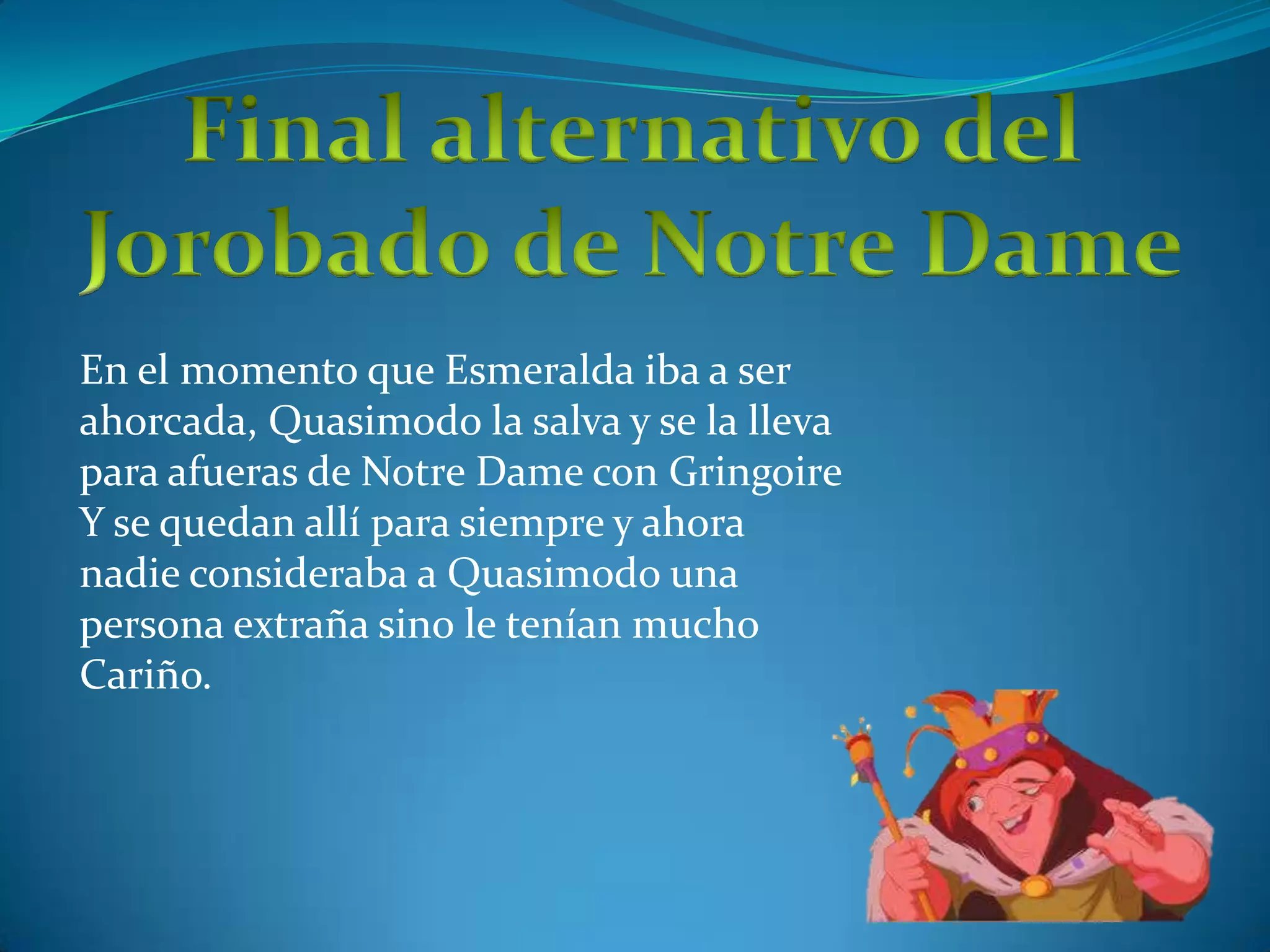 Quasimodo salva a Esmeralda de ser ahorcada y la lleva junto a Gringoire fuera de Notre Dame, donde ahora viven y nadie considera a Quasimodo como una persona extraña, sino que le tienen mucho cariño.