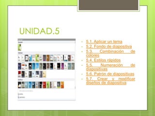 Este documento presenta una introducción a la unidad 5 de PowerPoint. Explica cómo aplicar temas y fondos de diapositiva, combinar colores, usar estilos rápidos, numerar diapositivas, crear y modificar patrones de diapositivas. Cada sección detalla las herramientas y opciones disponibles para personalizar la apariencia y diseño de las presentaciones.