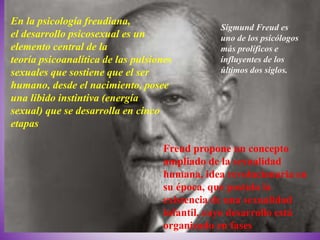 El documento resume las principales ideas de Sigmund Freud sobre el desarrollo psicosexual. Freud propuso que el desarrollo humano ocurre en 5 etapas (oral, anal, fálica, latencia y genital) donde diferentes partes del cuerpo se vuelven erógenas. Cada etapa presenta tareas que deben completarse para un desarrollo saludable. Las experiencias en las primeras etapas pueden afectar la personalidad del adulto. El documento también describe los complejos de Edipo y Electra.