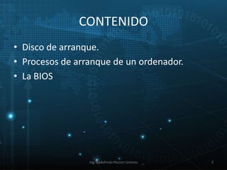 El documento describe el proceso de arranque de un ordenador desde que se enciende hasta que se carga el sistema operativo. La BIOS ejecuta una serie de comprobaciones (POST) de los componentes, luego busca el sector de arranque en el disco duro u otra unidad para cargar el gestor de arranque y, finalmente, el gestor de arranque carga el sistema operativo seleccionado por el usuario.