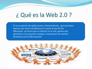 La Web 2.0 es un conjunto de aplicaciones y herramientas que permiten a los usuarios interactuar y compartir información de manera dinámica en la World Wide Web. Algunos ejemplos incluyen comunidades web, redes sociales, wikis y blogs. La Web 2.0 permite a los usuarios cambiar el contenido de un sitio web e interactuar con otros usuarios, en contraste con sitios web tradicionales donde los usuarios solo pueden ver información de forma pasiva.