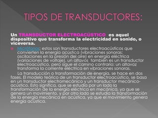 Un transductor electroacústico transforma la electricidad en sonido y viceversa. Los micrófonos convierten la energía acústica en eléctrica, mientras que los altavoces hacen lo contrario al transformar la corriente eléctrica en vibraciones sonoras. Existen diferentes tipos de transductores como los electromagnéticos, electromecánicos, electrostáticos y magnetoestrictivos, que transforman diferentes tipos de energía.