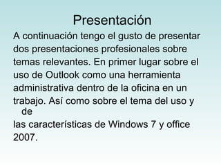 El documento presenta dos presentaciones profesionales realizadas por Edgar Isaí Ramírez López sobre el uso de Outlook como herramienta administrativa y Windows 7 y Office 2007, y sobre el diseño inteligente. Incluye menús, bibliografías y conclusiones sobre las presentaciones y la práctica constante de PowerPoint.