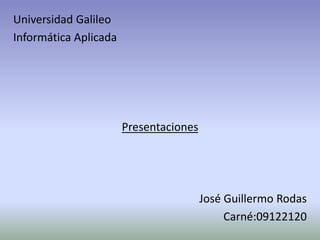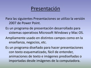 El documento presenta información sobre las presentaciones realizadas usando PowerPoint 2007. PowerPoint es un programa ampliamente utilizado para hacer presentaciones con texto, imágenes y animaciones. El documento también menciona el uso de Outlook, Windows 7 y Office 2007/2010 como herramientas útiles de oficina.