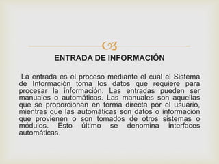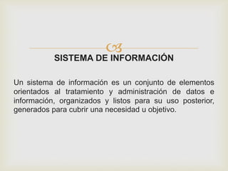 Un sistema de información es un conjunto de elementos organizados para procesar y administrar datos e información. Incluye la entrada de datos manuales o automáticos, el procesamiento de información mediante cálculos preestablecidos, y la salida de información procesada o datos de entrada a otros sistemas o módulos. La retroalimentación permite que parte de la salida del sistema regrese a la entrada para regular su comportamiento.